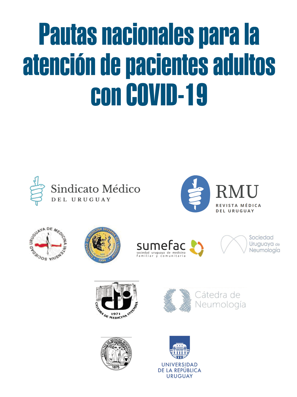 Vol. 37 Núm. Supl 1 (2021)Este suplemento constituye un esfuerzo del Sindicato Médico del Uruguay y de la Revista Médica del Uruguay para poner a disposición del cuerpo médico una importante recopilación de las pautas para el abordaje del paciente con enfermedad COVID 19 en los distintos niveles de atención. Las necesidades impuestas por la situación de la epidemia en Uruguay hizo que se priorizara su rápida difusión por encima de las exigencias de las publicaciones ordinarias de la Revista Médica del Uruguay. En consecuencia, la elaboración y los contenidos son autoría y responsabilidad de los autores, de las sociedades científicas y de las cátedras de la Facultad de Medicina de la Universidad de la República que aparecen mencionadas en cada sección. El Sindicato Médico del Uruguay y la Revista Médica del Uruguay están satisfechos de haber contribuido a la edición de esta valiosa información con el objetivo de que sea accesible en forma oportuna para todo el personal de salud del Uruguay.